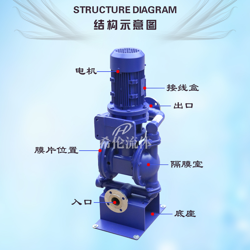 立式不锈钢电动隔膜泵原理电机(A)通过减速箱(B)带动左右两端柱塞上面的隔膜(D)一前一后往复运动。在左右两个泵腔内,装有上下四个单向球阀(C)隔膜的运动,造成工作腔内的容积的改变,迫使四个单向球阀交替地开启和关闭,从而将液体不断地吸入和排出。