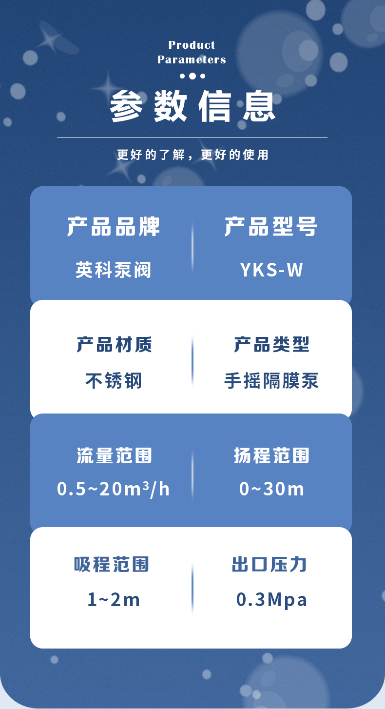 MPaYKS-W-10 10 0.5 0-2 0-30 1 3/8 0.3 YKS-W-15 15 0.75 0-2 0-30 1 1/2 0.3 YKS-W-20 20 1 0-2 0-30 2 3/4 0.3 YKS-W-25 25 3.5 0-2 0-30 2.5 1 0.3 YKS-W-40 40 4.5 0-2 0-30 4.5 1 1/2 0.3 YKS-W-50 50 6.5 0-2 0-30 8 2 0.3 YKS-W-65 65 10 0-2 0-30 8 2.5 0.3 YKS-W-80 80 16 0-2 0-30 10 3 0.3 YKS-W-100 100 20 0-2 0-30 10 4 0.3 食品卫生级手动隔膜泵用途1.制药工业:各类药液、血液制品、生物制品、糖衣、各类软膏、葡萄糖、口服液等、植物萃取液、片状物、药膏、酒精、过滤辅助物、超过滤、血浆、废溶剂。
